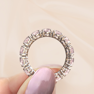 This is our Vivienne 4.7 ring. This specific type is called an eternity ring and it is set with a continuous line of identically cut gemstones. The ring is made in 14 Carat white gold and is set with small morganite champagne, 4.7 mm. The amazing morganite champagne are identical in size and are set in the ring band. Our morganite champagne are selected with great care so they are identical, which gives the best result. In order to get the best result, our artisans position all morganite champagne by hand with the utmost care. Our Goldsmiths have one ambition, which is creating the perfect ring. That is why we love what we do. In the end you get a stunning exclusive white gold ring with a row of morganite champagne which seem to have no beginning nor end. The perfect symbol of your undying love for her! How special is that!After receiving your order, our goldsmiths will passionately start the creative process of making your ring in our own studio. Because we don't have a big stockpile, these costs will not be passed on to you. Our pricing is proof of that! We offer top quality jewels at lowest price, guaranteed.Our talented designers add new designs to our online collection daily. Together they create a diverse collection of the finest jewellery. If you prefer to make a ring according your own design, please feel free to request a quote. We will make you an amazing offer, based on quality and price.To make it easier for you, we offer a 30 day return policy. Check our terms and conditions.