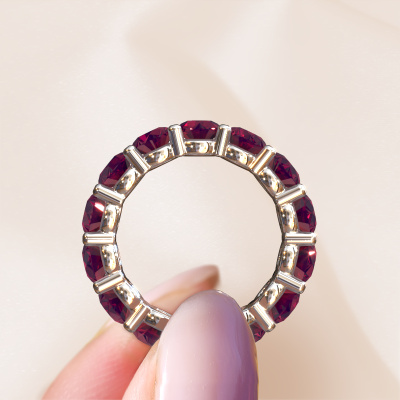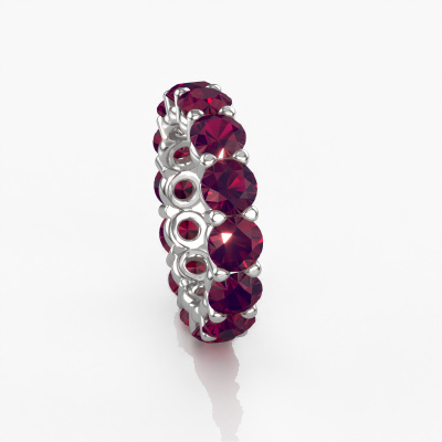 This is our Heddy rnd 5.0 ring. This specific type is called an eternity ring and it is set with a continuous line of identically cut gemstones. The ring is made in 14 Carat white gold and is set with small rhodolite, 5 mm. The amazing rhodolite are identical in size and are set in the ring band. Our rhodolite are selected with great care so they are identical, which gives the best result. In order to get the best result, our artisans position all rhodolite by hand with the utmost care. Our Goldsmiths have one ambition, which is creating the perfect ring. That is why we love what we do. In the end you get a stunning exclusive white gold ring with a row of rhodolite which seem to have no beginning nor end. The perfect symbol of your undying love for her! How special is that!By using a combination of the latest modern techniques, combined with ancient crafting, we can make all our rings in our own studio. Each jewel is made to order. This is advantageous because we can offer you a price you won't find anywhere else.