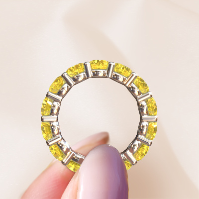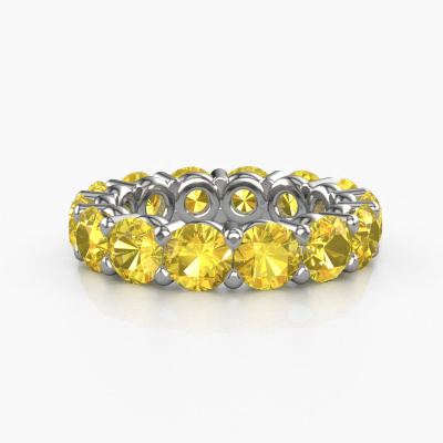 This is our Heddy rnd 5.0 ring. This specific type is called an eternity ring and it is set with a continuous line of identically cut gemstones. The ring is made in 14 Carat white gold and is set with small yellow sapphire, 5 mm. The amazing yellow sapphire are identical in size and are set in the ring band. Our yellow sapphire are selected with great care so they are identical, which gives the best result. In order to get the best result, our artisans position all yellow sapphire by hand with the utmost care. Our Goldsmiths have one ambition, which is creating the perfect ring. That is why we love what we do. In the end you get a stunning exclusive white gold ring with a row of yellow sapphire which seem to have no beginning nor end. The perfect symbol of your undying love for her! How special is that!By using a combination of the latest modern techniques, combined with ancient crafting, we can make all our rings in our own studio. Each jewel is made to order. This is advantageous because we can offer you a price you won't find anywhere else.