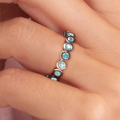 This is our Edwina 2 ring. This specific type is called an eternity ring and it is set with a continuous line of identically cut gemstones. The ring is made in 14 Carat white gold and is set with small blue topaz, 2.5 mm. The amazing blue topaz are identical in size and are set in the ring band. Our blue topaz are selected with great care so they are identical, which gives the best result. In order to get the best result, our artisans position all blue topaz by hand with the utmost care. Our Goldsmiths have one ambition, which is creating the perfect ring. That is why we love what we do. In the end you get a stunning trendy white gold stackable ring with a row of blue topaz which seem to have no beginning nor end. The perfect symbol of your undying love for her! How special is that!By using our modern techniques, we can design and customize the finest quality jewels with the utmost care for you. Our rings are always priced 30 percent lower than other jewellers. We make rings to order, so we don't have to maintain a large stock. If you have a certain budget, we are more than happy to advice you accordingly.Our talented designers add new designs to our online collection daily. Together they create a diverse collection of the finest jewellery. If you prefer to make a ring according your own design, please feel free to request a quote. We will make you an amazing offer, based on quality and price.To make it easier for you, we offer a 30 day return policy. Check our terms and conditions.