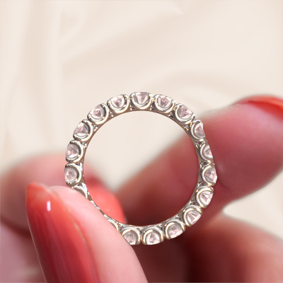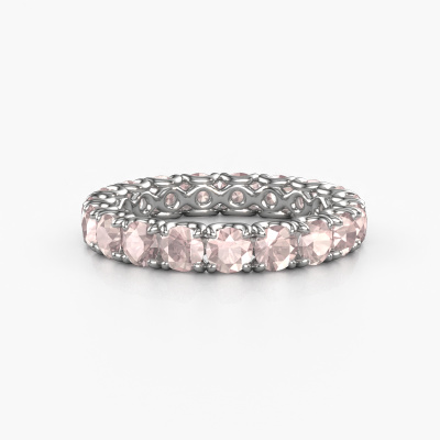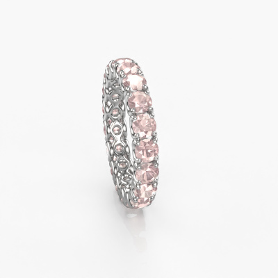 This is our Estee 3.4 ring. This specific type is called an eternity ring and it is set with a continuous line of identically cut gemstones. The ring is made in 14 Carat white gold and is set with small morganite champagne, 3.4 mm. The amazing morganite champagne are identical in size and are set in the ring band. Our morganite champagne are selected with great care so they are identical, which gives the best result. In order to get the best result, our artisans position all morganite champagne by hand with the utmost care. Our Goldsmiths have one ambition, which is creating the perfect ring. That is why we love what we do. In the end you get a stunning unique white gold stackable ring with a row of morganite champagne which seem to have no beginning nor end. The perfect symbol of your undying love for her! How special is that!