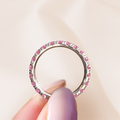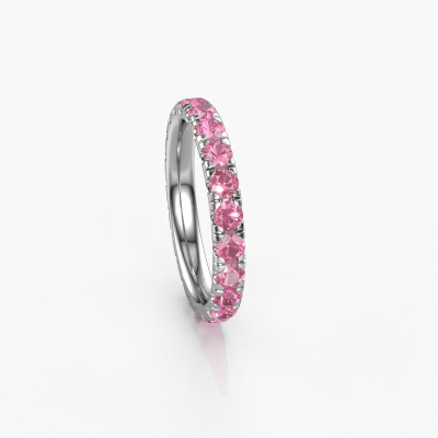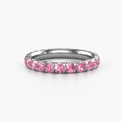 This is our Jackie 2.7 ring. This specific type is called an eternity ring and it is set with a continuous line of identically cut gemstones. The ring is made in 14 Carat white gold and is set with small pink sapphire, 2.7 mm. The amazing pink sapphire are identical in size and are set in the ring band. Our pink sapphire are selected with great care so they are identical, which gives the best result. In order to get the best result, our artisans position all pink sapphire by hand with the utmost care. Our Goldsmiths have one ambition, which is creating the perfect ring. That is why we love what we do. In the end you get a stunning modern white gold stackable ring with a row of pink sapphire which seem to have no beginning nor end. The perfect symbol of your undying love for her! How special is that!Because we design and deliver our own rings, we can offer you a ring at a price you won't find anywhere else. A ring is made to order, which helps prevent excess supplies, so we can make you a great price offer. We understand it feels risky, buying your ring online, but we will gladly assist in the designing process, taking your budget into consideration.Our team of talented, passionate designers add new ring designs to our online collection daily. Our objective in doing so, is to be able to offer you a wide variety of jewels. Please feel free to request a quote if you have specific wishes for your ring. We guarantee to make you an offer you can't refuse.To make it easier for you, we offer a 30 day return policy. Check our terms and conditions.