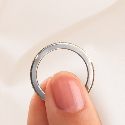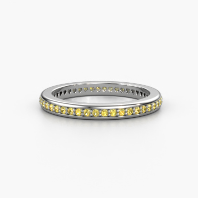 This is our Elvire 2 ring. This specific type is called an eternity ring and it is set with a continuous line of identically cut gemstones. The ring is made in 14 Carat white gold and is set with small yellow sapphire, 1.2 mm. The amazing yellow sapphire are identical in size and are set in the ring band. Our yellow sapphire are selected with great care so they are identical, which gives the best result. In order to get the best result, our artisans position all yellow sapphire by hand with the utmost care. Our Goldsmiths have one ambition, which is creating the perfect ring. That is why we love what we do. In the end you get a stunning modern white gold stackable ring with a row of yellow sapphire which seem to have no beginning nor end. The perfect symbol of your undying love for her! How special is that!Are you on a budget? Please feel free to contact us, so we can go discuss your options. We offer our rings at guaranteed best price, because we make them to order. You won't find such a price anywhere else!New jewellery designs are added to our online collection daily. Our team of passionate designers strive to create extraordinary and diverse designs. Have you seen a ring you like? Please feel free to contact us. Based on a good price/ quality ratio, we will make you an offer you can't refuse!To make it easier for you, we offer a 30 day return policy. Check our terms and conditions.