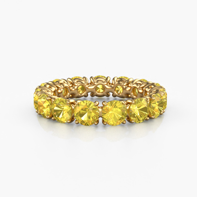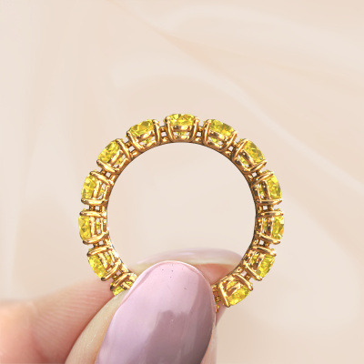 This is our Vivienne 4.2 ring. This specific type is called an eternity ring and it is set with a continuous line of identically cut gemstones. The ring is made in 14 Carat gold and is set with small yellow sapphire, 4.2 mm. This gold Eternity ring is a perfectly beautiful and meaningful way to give your proposal that special touch. The magnificent evenly shaped yellow sapphire are pave set around the ring. The identical yellow sapphire are carefully selected to give the ring a maximum effect. Do keep in mind we use natural resources so small differences between stones are common. The special effect is enhanced due to precise positioning of the yellow sapphire. This requires the utmost precision and a skilful hand but for our skilled artisans this is what excites them. The result is a ring with a row of yellow sapphire which seem to have no beginning nor end. The perfect symbol of your love for her! Isn't she a beauty?By using a combination of the latest modern techniques, combined with ancient crafting, we can make all our rings in our own studio. Each jewel is made to order. This is advantageous because we can offer you a price you won't find anywhere else.