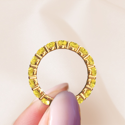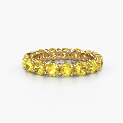 This is our Heddy rnd 3.7 ring. This specific type is called an eternity ring and it is set with a continuous line of identically cut gemstones. The ring is made in 14 Carat gold and is set with small yellow sapphire, 3.7 mm. This gold Eternity ring is a perfectly beautiful and meaningful way to give your proposal that special touch. The magnificent evenly shaped yellow sapphire are pave set around the ring. The identical yellow sapphire are carefully selected to give the ring a maximum effect. Do keep in mind we use natural resources so small differences between stones are common. The special effect is enhanced due to precise positioning of the yellow sapphire. This requires the utmost precision and a skilful hand but for our skilled artisans this is what excites them. The result is a stackable ring with a row of yellow sapphire which seem to have no beginning nor end. The perfect symbol of your love for her! Isn't she a beauty?By using our modern techniques, we can design and customize the finest quality jewels with the utmost care for you. Our rings are always priced 30 percent lower than other jewellers. We make rings to order, so we don't have to maintain a large stock. If you have a certain budget, we are more than happy to advice you accordingly.New jewellery designs are added to our online collection daily. Our team of passionate designers strive to create extraordinary and diverse designs. Have you seen a ring you like? Please feel free to contact us. Based on a good price/ quality ratio, we will make you an offer you can't refuse!To make it easier for you, we offer a 30 day return policy. Check our terms and conditions.