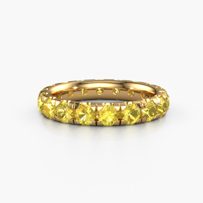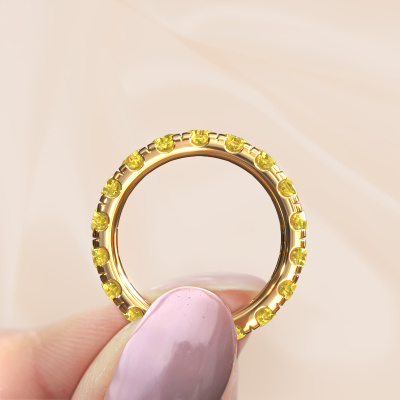 This is our Jackie 3.4 ring. This specific type is called an eternity ring and it is set with a continuous line of identically cut gemstones. The ring is made in 14 Carat gold and is set with small yellow sapphire, 3.4 mm. This gold Eternity ring is a perfectly beautiful and meaningful way to give your proposal that special touch. The magnificent evenly shaped yellow sapphire are pave set around the ring. The identical yellow sapphire are carefully selected to give the ring a maximum effect. Do keep in mind we use natural resources so small differences between stones are common. The special effect is enhanced due to precise positioning of the yellow sapphire. This requires the utmost precision and a skilful hand but for our skilled artisans this is what excites them. The result is a stackable ring with a row of yellow sapphire which seem to have no beginning nor end. The perfect symbol of your love for her! Isn't she a beauty?After receiving your order, our goldsmiths will passionately start the creative process of making your ring in our own studio. Because we don't have a big stockpile, these costs will not be passed on to you. Our pricing is proof of that! We offer top quality jewels at lowest price, guaranteed.Our talented designers add new designs to our online collection daily. Together they create a diverse collection of the finest jewellery. If you prefer to make a ring according your own design, please feel free to request a quote. We will make you an amazing offer, based on quality and price.To make it easier for you, we offer a 30 day return policy. Check our terms and conditions.