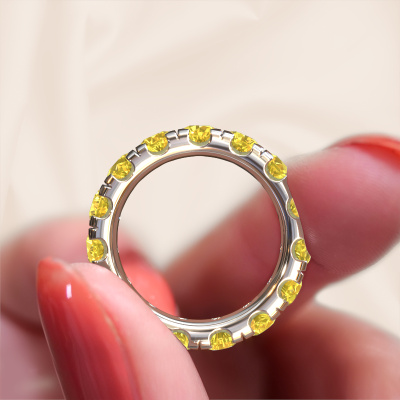 This is our Jackie 4.2 ring. This specific type is called an eternity ring and it is set with a continuous line of identically cut gemstones. The ring is made in platinum and is set with small yellow sapphire, 4.2 mm. This platinum Eternity ring is a perfectly beautiful and meaningful way to give your proposal that special touch. The magnificent evenly shaped yellow sapphire are pave set around the ring. The identical yellow sapphire are carefully selected to give the ring a maximum effect. Do keep in mind we use natural resources so small differences between stones are common. The special effect is enhanced due to precise positioning of the yellow sapphire. This requires the utmost precision and a skilful hand but for our skilled artisans this is what excites them. The result is a stackable ring with a row of yellow sapphire which seem to have no beginning nor end. The perfect symbol of your love for her! Isn't she a beauty?After receiving your order, our goldsmiths will start the creative process of making your Jackie 4.2 ring. We don't keep stock. This is advantageous because these costs will not be passed on to you. Therefore, we can offer jewellery at exceptionally low prices.New jewellery designs are added to our online collection daily. Our team of passionate designers strive to create extraordinary and diverse designs. Have you seen a ring you like? Please feel free to contact us. Based on a good price/ quality ratio, we will make you an offer you can't refuse!To make it easier for you, we offer a 30 day return policy. Check our terms and conditions.