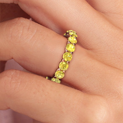 This is our Michelle full 3.4 ring. This specific type is called an eternity ring and it is set with a continuous line of identically cut gemstones. The ring is made in 14 Carat rose gold and is set with small yellow sapphire, 3.4 mm. This rose gold Eternity ring is a perfectly beautiful and meaningful way to give your proposal that special touch. The magnificent evenly shaped yellow sapphire are pave set around the ring. The identical yellow sapphire are carefully selected to give the ring a maximum effect. Do keep in mind we use natural resources so small differences between stones are common. The special effect is enhanced due to precise positioning of the yellow sapphire. This requires the utmost precision and a skilful hand but for our skilled artisans this is what excites them. The result is a stackable ring with a row of yellow sapphire which seem to have no beginning nor end. The perfect symbol of your love for her! Isn't she a beauty?By using a combination of the latest modern techniques, combined with ancient crafting, we can make all our rings in our own studio. Each jewel is made to order. This is advantageous because we can offer you a price you won't find anywhere else.New jewellery designs are added to our online collection daily. Our team of passionate designers strive to create extraordinary and diverse designs. Have you seen a ring you like? Please feel free to contact us. Based on a good price/ quality ratio, we will make you an offer you can't refuse!To make it easier for you, we offer a 30 day return policy. Check our terms and conditions.