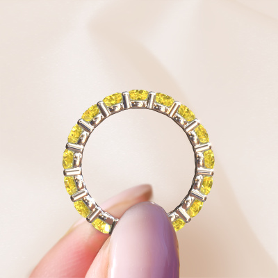 This is our Heddy rnd 3.7 ring. This specific type is called an eternity ring and it is set with a continuous line of identically cut gemstones. The ring is made in 14 Carat white gold and is set with small yellow sapphire, 3.7 mm. This white gold Eternity ring is a perfectly beautiful and meaningful way to give your proposal that special touch. The magnificent evenly shaped yellow sapphire are pave set around the ring. The identical yellow sapphire are carefully selected to give the ring a maximum effect. Do keep in mind we use natural resources so small differences between stones are common. The special effect is enhanced due to precise positioning of the yellow sapphire. This requires the utmost precision and a skilful hand but for our skilled artisans this is what excites them. The result is a stackable ring with a row of yellow sapphire which seem to have no beginning nor end. The perfect symbol of your love for her! Isn't she a beauty?By using our modern techniques, we can design and customize the finest quality jewels with the utmost care for you. Our rings are always priced 30 percent lower than other jewellers. We make rings to order, so we don't have to maintain a large stock. If you have a certain budget, we are more than happy to advice you accordingly.New jewellery designs are added to our online collection daily. Our team of passionate designers strive to create extraordinary and diverse designs. Have you seen a ring you like? Please feel free to contact us. Based on a good price/ quality ratio, we will make you an offer you can't refuse!To make it easier for you, we offer a 30 day return policy. Check our terms and conditions.