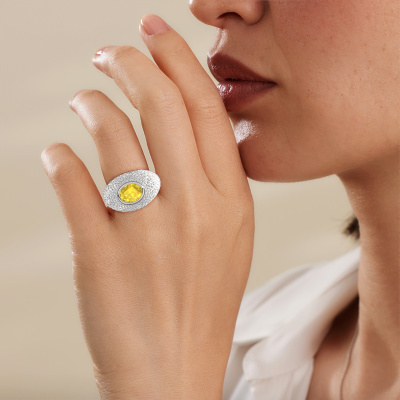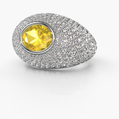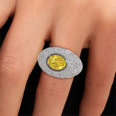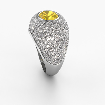 Are you looking for a pavé set ring with an eye-catching single gemstone? How do you like this Armida ring? This white gold Armida ring is set with a beautiful 9x7 mm oval yellow sapphire. The yellow sapphire is carefully selected by our yellow sapphire suppliers. Subsequently, these gemstones are then set by our goldsmith according to ancient tradition. The ring will then be polished to perfection creating a unique ring with a stunning yellow sapphire. Created especially for you. How do you like this exclusive white gold ring? Simply customize this Armida ring, using our online tool. Subsequently, your personal pavé set Armida ring will be made by hand by our goldsmiths. Precious metals and gemstones can be customized to your liking. Do you have specific preferences which are unavailable in our online tool? Please feel free to contact us. We will customize your personal exclusive ring to your liking.Because we design and deliver our own rings, we can offer you a ring at a price you won't find anywhere else. A ring is made to order, which helps prevent excess supplies, so we can make you a great price offer. We understand it feels risky, buying your ring online, but we will gladly assist in the designing process, taking your budget into consideration.To make it easier for you, we offer a 30 day return policy. Check our terms and conditions.