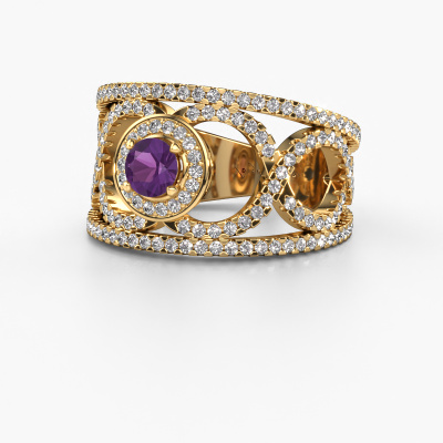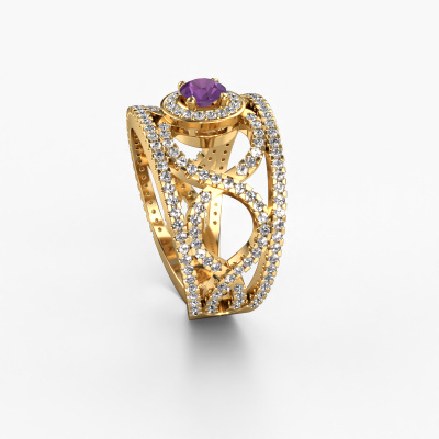 This exclusive gold Regina ring is a true work of art! This ring is made of 14 Carat gold and is set with 4.2 mm round amethyst. The smallest ornaments are crafted by our goldsmith with a lot of patience and great passion. In order to create this ring with great precision, this craft requires a keen eye and a skilful hand. A challenge which ignites a fire in our expert goldsmiths. The exquisite amethysten are set in a way that their unique qualities are strengthened. This gives the ring an even more glamorous appearance. The ring is unique by itself though, because of the natural birthstones we selected especially for this Regina ring. And by choosing the precious metal yourself, you create a unique ring. How do you like this exclusive gold ring? Simply customize this Regina ring, using our online tool. Subsequently, your personal special Regina ring will be made by hand by our goldsmiths. Precious metals and gemstones can be customized to your liking. Do you have specific preferences which are unavailable in our online tool? Please feel free to contact us. We will customize your personal exclusive ring to your liking.By using our modern techniques, we can design and customize the finest quality jewels with the utmost care for you. Our rings are always priced 30 percent lower than other jewellers. We make rings to order, so we don't have to maintain a large stock. If you have a certain budget, we are more than happy to advice you accordingly.To make it easier for you, we offer a 30 day return policy. Check our terms and conditions.