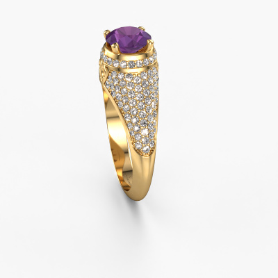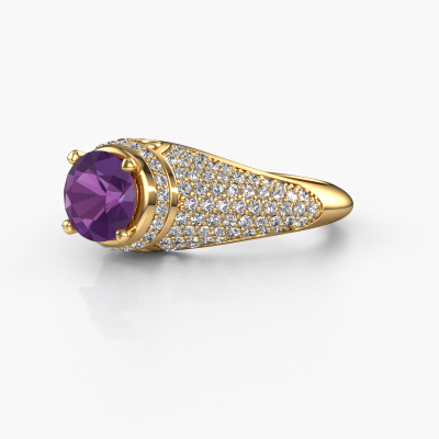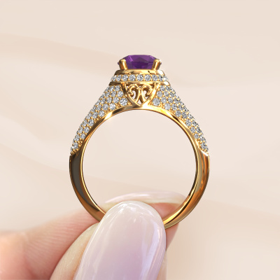 This exclusive gold Sharee ring is a true work of art! This ring is made of 14 Carat gold and is set with 6.5 mm round amethyst. The smallest ornaments are crafted by our goldsmith with a lot of patience and great passion. In order to create this ring with great precision, this craft requires a keen eye and a skilful hand. A challenge which ignites a fire in our expert goldsmiths. The exquisite amethysten are set in a way that their unique qualities are strengthened. This gives the ring an even more glamorous appearance. The ring is unique by itself though, because of the natural birthstones we selected especially for this Sharee ring. And by choosing the precious metal yourself, you create a unique ring. The special sharee ring, as shown here, can be customized to your liking. Our online tool offers many different options but please feel free to contact us if you want changes made to your sharee ring, which are unavailable in our online tool.Because we design and deliver our own rings, we can offer you a ring at a price you won't find anywhere else. A ring is made to order, which helps prevent excess supplies, so we can make you a great price offer. We understand it feels risky, buying your ring online, but we will gladly assist in the designing process, taking your budget into consideration.To make it easier for you, we offer a 30 day return policy. Check our terms and conditions.