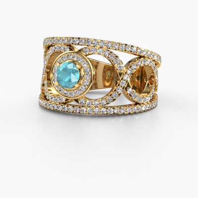 This exclusive gold Regina ring is a true work of art! This ring is made of 14 Carat gold and is set with 4.2 mm round blue topaz. The smallest ornaments are crafted by our goldsmith with a lot of patience and great passion. In order to create this ring with great precision, this craft requires a keen eye and a skilful hand. A challenge which ignites a fire in our expert goldsmiths. The exquisite blue topaz are set in a way that their unique qualities are strengthened. This gives the ring an even more glamorous appearance. The ring is unique by itself though, because of the natural birthstones we selected especially for this Regina ring. And by choosing the precious metal yourself, you create a unique ring. How do you like this exclusive gold ring? Simply customize this Regina ring, using our online tool. Subsequently, your personal special Regina ring will be made by hand by our goldsmiths. Precious metals and gemstones can be customized to your liking. Do you have specific preferences which are unavailable in our online tool? Please feel free to contact us. We will customize your personal exclusive ring to your liking.By using our modern techniques, we can design and customize the finest quality jewels with the utmost care for you. Our rings are always priced 30 percent lower than other jewellers. We make rings to order, so we don't have to maintain a large stock. If you have a certain budget, we are more than happy to advice you accordingly.To make it easier for you, we offer a 30 day return policy. Check our terms and conditions.
