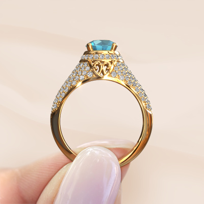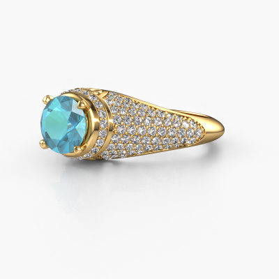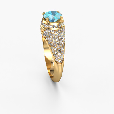 This exclusive gold Sharee ring is a true work of art! This ring is made of 14 Carat gold and is set with 6.5 mm round blue topaz. The smallest ornaments are crafted by our goldsmith with a lot of patience and great passion. In order to create this ring with great precision, this craft requires a keen eye and a skilful hand. A challenge which ignites a fire in our expert goldsmiths. The exquisite blue topaz are set in a way that their unique qualities are strengthened. This gives the ring an even more glamorous appearance. The ring is unique by itself though, because of the natural birthstones we selected especially for this Sharee ring. And by choosing the precious metal yourself, you create a unique ring. The special sharee ring, as shown here, can be customized to your liking. Our online tool offers many different options but please feel free to contact us if you want changes made to your sharee ring, which are unavailable in our online tool.Because we design and deliver our own rings, we can offer you a ring at a price you won't find anywhere else. A ring is made to order, which helps prevent excess supplies, so we can make you a great price offer. We understand it feels risky, buying your ring online, but we will gladly assist in the designing process, taking your budget into consideration.To make it easier for you, we offer a 30 day return policy. Check our terms and conditions.