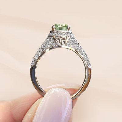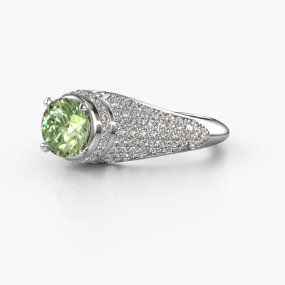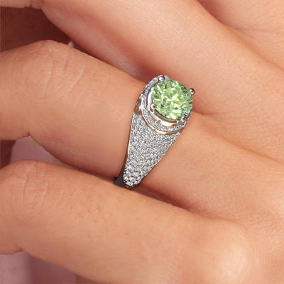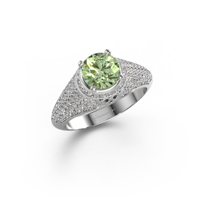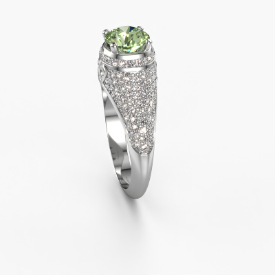 This exclusive platinum Sharee ring is a true work of art! This ring is made of platinum and is set with 6.5 mm round green lab grown diamond. The smallest ornaments are crafted by our goldsmith with a lot of patience and great passion. In order to create this ring with great precision, this craft requires a keen eye and a skilful hand. A challenge which ignites a fire in our expert goldsmiths. The exquisite green lab grown diamonds are set in a way that their unique qualities are strengthened. This gives the ring an even more glamorous appearance. The ring is unique by itself though, because of the natural birthstones we selected especially for this Sharee ring. And by choosing the precious metal yourself, you create a unique ring. The special sharee ring, as shown here, can be customized to your liking. Our online tool offers many different options but please feel free to contact us if you want changes made to your sharee ring, which are unavailable in our online tool.Because we design and deliver our own rings, we can offer you a ring at a price you won't find anywhere else. A ring is made to order, which helps prevent excess supplies, so we can make you a great price offer. We understand it feels risky, buying your ring online, but we will gladly assist in the designing process, taking your budget into consideration.To make it easier for you, we offer a 30 day return policy. Check our terms and conditions.