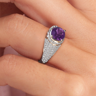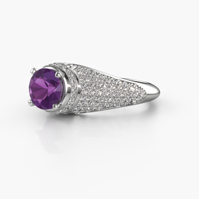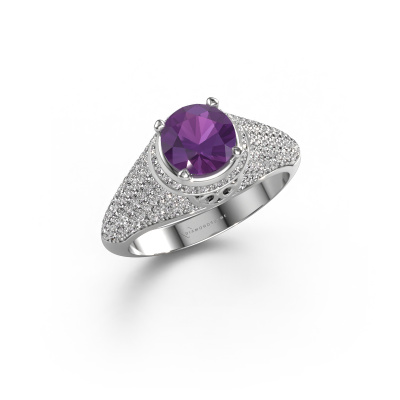 This exclusive white gold Sharee ring is a true work of art! This ring is made of 14 Carat white gold and is set with 6.5 mm round amethyst. The smallest ornaments are crafted by our goldsmith with a lot of patience and great passion. In order to create this ring with great precision, this craft requires a keen eye and a skilful hand. A challenge which ignites a fire in our expert goldsmiths. The exquisite amethysten are set in a way that their unique qualities are strengthened. This gives the ring an even more glamorous appearance. The ring is unique by itself though, because of the natural birthstones we selected especially for this Sharee ring. And by choosing the precious metal yourself, you create a unique ring. The special sharee ring, as shown here, can be customized to your liking. Our online tool offers many different options but please feel free to contact us if you want changes made to your sharee ring, which are unavailable in our online tool.Because we design and deliver our own rings, we can offer you a ring at a price you won't find anywhere else. A ring is made to order, which helps prevent excess supplies, so we can make you a great price offer. We understand it feels risky, buying your ring online, but we will gladly assist in the designing process, taking your budget into consideration.To make it easier for you, we offer a 30 day return policy. Check our terms and conditions.