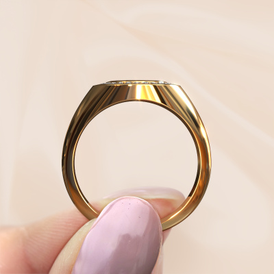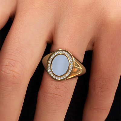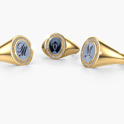 This gold women´s signet ring is a true work of art! This is our special Hilda 1 signet ring and it is set with a oval shape light blue sardonyx. In our crafting studio, we use a combination of the latest techniques and ancient traditional craftsmanship, so we are able to create a detailed perfect signet ring. Our expert goldsmiths are fascinated by signet rings. The signet ring can be engraved with initials or a family weapon. Signet rings with family weapons can be handed down from generation to generation and that usually is the case. On top of that, a signet ring is a beautiful, classy piece of jewellery which is trending once more. More than one reason to start or extend the tradition. Please browse our online database for more options on engravings. You can find the departments of our education centre at the bottom of this page. How do you like this fantasy gold signet ring? Simply customize this Hilda 1 signet ring, using our online tool. Subsequently, your personal special Hilda 1 signet ring will be made by hand by our goldsmiths. Precious metals and gemstones can be customized to your liking. Do you have specific preferences which are unavailable in our online tool? Please feel free to contact us. We will customize your personal fantasy signet ring to your liking.After receiving your order, our goldsmiths will passionately start the creative process of making your ring in our own studio. Because we don't have a big stockpile, these costs will not be passed on to you. Our pricing is proof of that! We offer top quality jewels at lowest price, guaranteed.To make it easier for you, we offer a 30 day return policy. Check our terms and conditions.