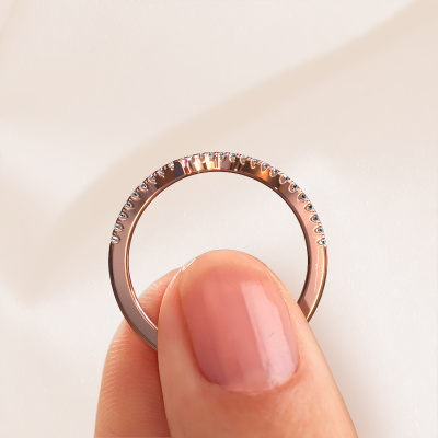 This SR0633-1 stackable ring in 14 Carat rose gold is set with diamond. This rose gold stacked SR0633-1 ring is the perfect addition to your ring collection! As the name suggests, it is a ring which can be combined on one finger with another ring. It gives you the opportunity to create your own style. A stacked ring usually represents a certain memory of someone special or a memorable moment. It is common to combine a stacked ring, representing an anniversary, with a wedding ring. But this fine ring, combined with your other rings, also makes a classy fashion item. The fine SR0633-1 stackable ring, as shown here, can be customized to your liking. Our online tool offers many different options but please feel free to contact us if you want changes made to your SR0633-1 stackable ring, which are unavailable in our online tool.Are you on a budget? Please feel free to contact us, so we can go discuss your options. We offer our rings at guaranteed best price, because we make them to order. You won't find such a price anywhere else!To make it easier for you, we offer a 30 day return policy. Check our terms and conditions.