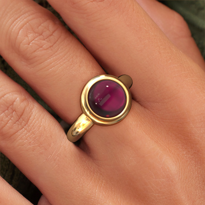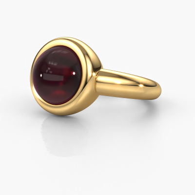 In this photo the gold Jenae ring is set with a cabochon garnet. Cabochon means a garnet is shaped first, not faceted, into a specific shape, such as a drop, heart or round cabochon. Subsequently, it is polished until the gemstone has a orb shaped surface. A cabochon gemstone is a stunning, classy eye-catcher that matches perfectly with a contemporary as well as a vintage style. Our expert goldsmiths shape the beautiful ring to perfection which makes it unique. The cabochon garnet is set so its unique qualities are strengthened. A customized trendy ring is the perfect gift! New exquisite designs are added daily by our team of passionate goldsmiths. And each design can be customized. Simply customize the precious metals and the colour of gemstones which will be used, for example. This makes your design of the trendy Jenae ring truly unique!By using a combination of the latest modern techniques, combined with ancient crafting, we can make all our rings in our own studio. Each jewel is made to order. This is advantageous because we can offer you a price you won't find anywhere else.To make it easier for you, we offer a 30 day return policy. Check our terms and conditions.