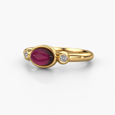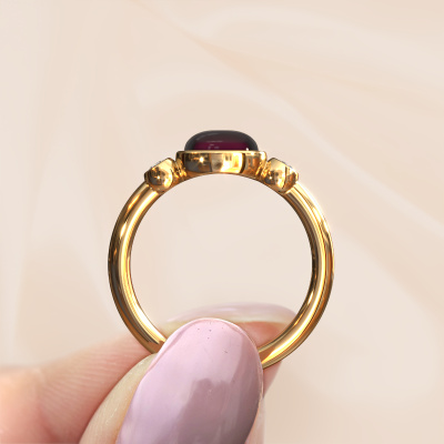 In this photo the gold Liane ring is set with a cabochon garnet. Cabochon means a garnet is shaped first, not faceted, into a specific shape, such as a drop, heart or oval cabochon. Subsequently, it is polished until the gemstone has a orb shaped surface. A cabochon gemstone is a stunning, classy eye-catcher that matches perfectly with a contemporary as well as a vintage style. Our expert goldsmiths shape the graceful ring to perfection which makes it unique. The cabochon garnet is set so its unique qualities are strengthened. Our goldsmiths passionately create your customized ring to your liking with the utmost care. The gold ring, as shown here, can be customized using our online tool. Feel free to ask our jewel designers for assistance if you want changes made which are unavailable in our online tool. We are happy to answer your questions.By using a combination of the latest modern techniques, combined with ancient crafting, we can make all our rings in our own studio. Each jewel is made to order. This is advantageous because we can offer you a price you won't find anywhere else.To make it easier for you, we offer a 30 day return policy. Check our terms and conditions.