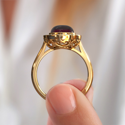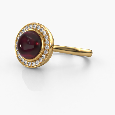 Are you looking for a royal ring with an eye-catching single gemstone? How do you like this Alisa ring? This gold Alisa ring is set with a beautiful 8 mm round cabochon garnet. The garnet is carefully selected by our garnet suppliers. Subsequently, these birthstones are then set by our goldsmith according to ancient tradition. The ring will then be polished to perfection creating a unique ring with a stunning garnet. Created especially for you. A customized fantasy ring is the perfect gift! New exquisite designs are added daily by our team of passionate goldsmiths. And each design can be customized. Simply customize the precious metals and the colour of gemstones which will be used, for example. This makes your design of the fantasy Alisa ring truly unique!Are you on a budget? Please feel free to contact us, so we can go discuss your options. We offer our rings at guaranteed best price, because we make them to order. You won't find such a price anywhere else!To make it easier for you, we offer a 30 day return policy. Check our terms and conditions.