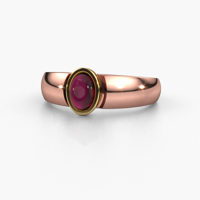 In this photo the rose gold Tonneke ring is set with a cabochon garnet. Cabochon means a garnet is shaped first, not faceted, into a specific shape, such as a drop, heart or oval cabochon. Subsequently, it is polished until the gemstone has a orb shaped surface. A cabochon gemstone is a stunning, classy eye-catcher that matches perfectly with a contemporary as well as a vintage style. Our expert goldsmiths shape the tasteful ring to perfection which makes it unique. The cabochon garnet is set so its unique qualities are strengthened. A customized modern ring is the perfect gift! New exquisite designs are added daily by our team of passionate goldsmiths. And each design can be customized. Simply customize the precious metals and the colour of gemstones which will be used, for example. This makes your design of the modern Tonneke ring truly unique!Because we design and deliver our own rings, we can offer you a ring at a price you won't find anywhere else. A ring is made to order, which helps prevent excess supplies, so we can make you a great price offer. We understand it feels risky, buying your ring online, but we will gladly assist in the designing process, taking your budget into consideration.To make it easier for you, we offer a 30 day return policy. Check our terms and conditions.
