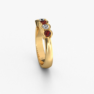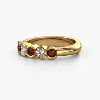 This ring is called Lotte 5. It is made of 14 Carat gold and is set with 3 mm garnet. Are you looking for a unique gold ring with a modern appearance? Then this is the ring for you. Simply customize to your or her liking. Perfect for a modern, contemporary woman! This 5 stones ring is adorned with stunning garnet. It was carefully selected because your ring must be adorned with nothing but the most beautiful gemstones. Our expert goldsmith will create your ring in our own studio, where the garnet will be set with great care. The ring will then be polished to perfection to create a beautiful ring. By using a combination of the latest modern techniques, combined with ancient crafting, we can make all our rings in our own studio. Each jewel is made to order. This is advantageous because we can offer you a price you won't find anywhere else.Our team of talented, passionate designers add new ring designs to our online collection daily. Our objective in doing so, is to be able to offer you a wide variety of jewels. Please feel free to request a quote if you have specific wishes for your ring. We guarantee to make you an offer you can't refuse.To make it easier for you, we offer a 30 day return policy. Check our terms and conditions.