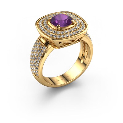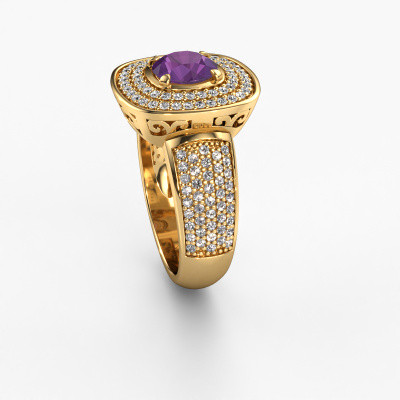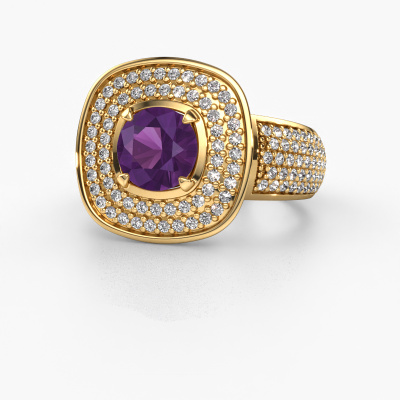 This exclusive gold Eliana ring is a true work of art! This ring is made of 14 Carat gold and is set with 6 mm round amethyst. The smallest ornaments are crafted by our goldsmith with a lot of patience and great passion. In order to create this ring with great precision, this craft requires a keen eye and a skilful hand. A challenge which ignites a fire in our expert goldsmiths. The exquisite amethysten are set in a way that their unique qualities are strengthened. This gives the ring an even more glamorous appearance. The ring is unique by itself though, because of the natural birthstones we selected especially for this Eliana ring. And by choosing the precious metal yourself, you create a unique ring. As soon as you finished designing your Eliana ring with our online tool, our goldsmiths will start their creative process of making your ring. This will be done with passion and care, according ancient crafting. On top of that, our jewels are made of eco-friendly materials. Simply customize online with our online tool, if you want any changes made. If you want specific changes made to your Eliana ring, that are unavailable in our online tool, please feel free to contact our expert designers.By using a combination of the latest modern techniques, combined with ancient crafting, we can make all our rings in our own studio. Each jewel is made to order. This is advantageous because we can offer you a price you won't find anywhere else.To make it easier for you, we offer a 30 day return policy. Check our terms and conditions.