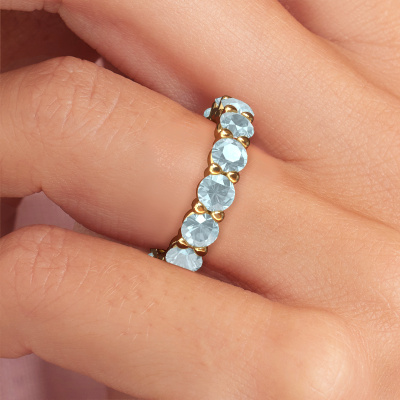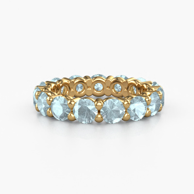 This exclusive gold Heddy rnd 4.2 ring is a true work of art! This ring is made of 14 Carat gold and is set with 4.2 mm round aquamarine. The smallest ornaments are crafted by our goldsmith with a lot of patience and great passion. In order to create this ring with great precision, this craft requires a keen eye and a skilful hand. A challenge which ignites a fire in our expert goldsmiths. The exquisite aquamarine are set in a way that their unique qualities are strengthened. This gives the ring an even more glamorous appearance. The ring is unique by itself though, because of the natural birthstones we selected especially for this Heddy rnd 4.2 ring. And by choosing the precious metal yourself, you create a unique ring. The best part of this eternity ring is that you can customize it to your own liking. Your style, your choice, your ring. On top of that, your exclusive gold ring will be made by hand with eco-friendly materials! Please feel free to easily customize the ring, using our online tool.After receiving your order, our goldsmiths will start the creative process of making your Heddy rnd 4.2 ring. We don't keep stock. This is advantageous because these costs will not be passed on to you. Therefore, we can offer jewellery at exceptionally low prices.To make it easier for you, we offer a 30 day return policy. Check our terms and conditions.