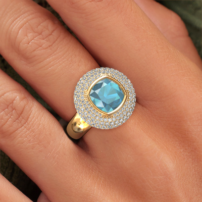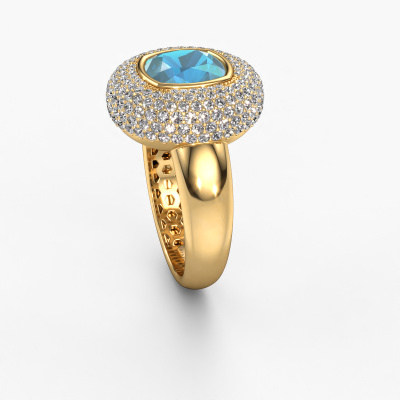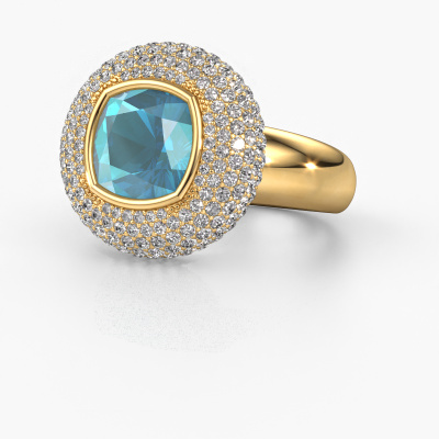 This exclusive gold Keshia ring is a true work of art! This ring is made of 14 Carat gold and is set with 8 mm cushion blue topaz. The smallest ornaments are crafted by our goldsmith with a lot of patience and great passion. In order to create this ring with great precision, this craft requires a keen eye and a skilful hand. A challenge which ignites a fire in our expert goldsmiths. The exquisite blue topaz are set in a way that their unique qualities are strengthened. This gives the ring an even more glamorous appearance. The ring is unique by itself though, because of the natural birthstones we selected especially for this Keshia ring. And by choosing the precious metal yourself, you create a unique ring. Our goldsmiths passionately create your customized ring to your liking with the utmost care. The gold ring, as shown here, can be customized using our online tool. Feel free to ask our jewel designers for assistance if you want changes made which are unavailable in our online tool. We are happy to answer your questions.By using our modern techniques, we can design and customize the finest quality jewels with the utmost care for you. Our rings are always priced 30 percent lower than other jewellers. We make rings to order, so we don't have to maintain a large stock. If you have a certain budget, we are more than happy to advice you accordingly.To make it easier for you, we offer a 30 day return policy. Check our terms and conditions.