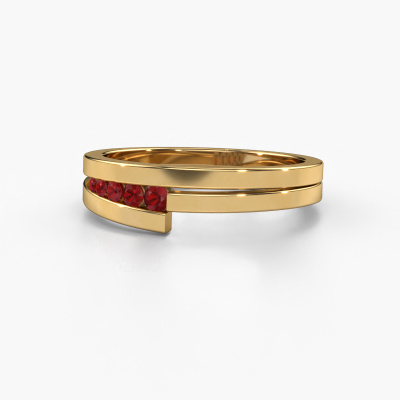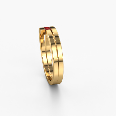 This ring is called Cato. It is made of 14 Carat gold and is set with 2.2 mm ruby. Are you looking for a unique gold ring with a modern appearance? Then this is the ring for you. Simply customize to your or her liking. Perfect for a modern, contemporary woman! This elegant ring is adorned with stunning ruby. It was carefully selected because your ring must be adorned with nothing but the most beautiful gemstones. Our expert goldsmith will create your ring in our own studio, where the ruby will be set with great care. The ring will then be polished to perfection to create a beautiful ring. Because we design and deliver our own rings, we can offer you a ring at a price you won't find anywhere else. A ring is made to order, which helps prevent excess supplies, so we can make you a great price offer. We understand it feels risky, buying your ring online, but we will gladly assist in the designing process, taking your budget into consideration.Our talented designers add new designs to our online collection daily. Together they create a diverse collection of the finest jewellery. If you prefer to make a ring according your own design, please feel free to request a quote. We will make you an amazing offer, based on quality and price.To make it easier for you, we offer a 30 day return policy. Check our terms and conditions.