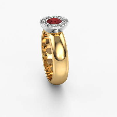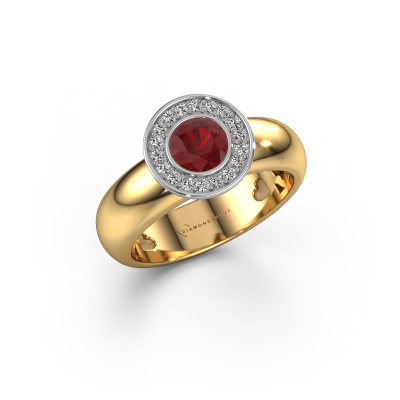 The ring shown above is called Anna. This type of ring is known as a solitaire ring. The 14 Carat gold ring is set with a 5 mm round ruby centre stone surrounded by smaller sized diamonds. This halo gold halo ring, is set with a big ruby embraced by smaller sized gemstones. The ring got its name for its halo which the smaller sized diamonds help create. In order to achieve a stunning halo, these smaller sized gemstones have to be aligned perfectly so light reflects evenly on the ruby from every angle. And our expert goldsmiths get the job done. Each carefully selected ruby is set by hand with utmost precision. During manufacturing, light fall is constantly monitored to make sure the special halo effect is still visible. In the end you get a unique ring with a radiant ruby gemstone centrepiece. An exquisite ring indeed! The halo Anna ring, as shown here, can be customized to your liking. Our online tool offers many different options but please feel free to contact us if you want changes made to your Anna ring, which are unavailable in our online tool.Are you on a budget? Please feel free to contact us, so we can go discuss your options. We offer our rings at guaranteed best price, because we make them to order. You won't find such a price anywhere else!To make it easier for you, we offer a 30 day return policy. Check our terms and conditions.