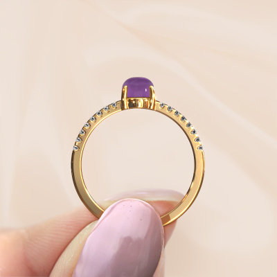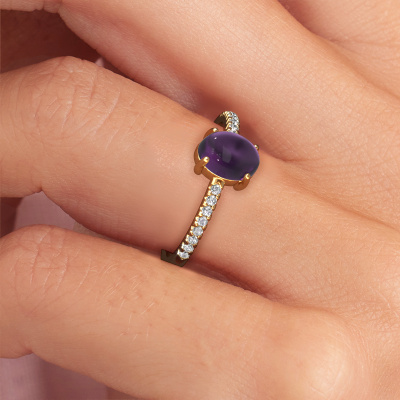 In this photo the gold Becky ring is set with a cabochon amethyst. Cabochon means a amethyst is shaped first, not faceted, into a specific shape, such as a drop, heart or oval cabochon. Subsequently, it is polished until the gemstone has a orb shaped surface. A cabochon gemstone is a stunning, classy eye-catcher that matches perfectly with a contemporary as well as a vintage style. Our expert goldsmiths shape the birthstones ring to perfection which makes it unique. The cabochon amethyst is set so its unique qualities are strengthened. How do you like this fantasy gold ring? Simply customize this Becky ring, using our online tool. Subsequently, your personal birthstones Becky ring will be made by hand by our goldsmiths. Precious metals and gemstones can be customized to your liking. Do you have specific preferences which are unavailable in our online tool? Please feel free to contact us. We will customize your personal fantasy ring to your liking.By using a combination of the latest modern techniques, combined with ancient crafting, we can make all our rings in our own studio. Each jewel is made to order. This is advantageous because we can offer you a price you won't find anywhere else.To make it easier for you, we offer a 30 day return policy. Check our terms and conditions.
