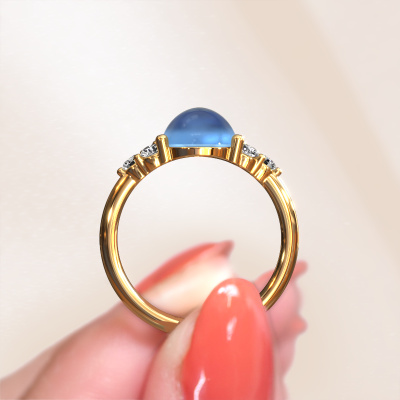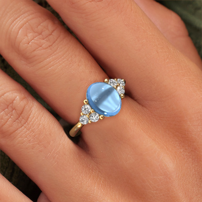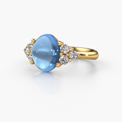 In this photo the gold Clarice ring is set with a cabochon blue topaz. Cabochon means a blue topaz is shaped first, not faceted, into a specific shape, such as a drop, heart or oval cabochon. Subsequently, it is polished until the gemstone has a orb shaped surface. A cabochon gemstone is a stunning, classy eye-catcher that matches perfectly with a contemporary as well as a vintage style. Our expert goldsmiths shape the charming ring to perfection which makes it unique. The cabochon blue topaz is set so its unique qualities are strengthened. Customize your own charmingClarice ring, which will then be created by our goldsmiths with great passion. Do you prefer a different option than is shown here in the gold Clarice ring? Then our online tools offers various options. Feel free to ask us for help if you are unable to succeed. We are happy to answer your questions!By using a combination of the latest modern techniques, combined with ancient crafting, we can make all our rings in our own studio. Each jewel is made to order. This is advantageous because we can offer you a price you won't find anywhere else.To make it easier for you, we offer a 30 day return policy. Check our terms and conditions.