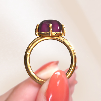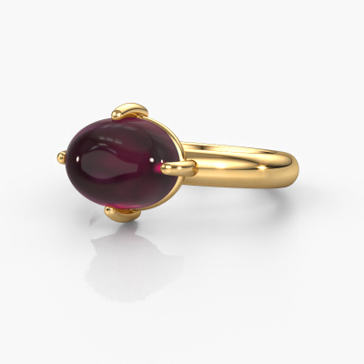 In this photo the gold Melodee ring is set with a cabochon rhodolite. Cabochon means a rhodolite is shaped first, not faceted, into a specific shape, such as a drop, heart or oval cabochon. Subsequently, it is polished until the gemstone has a orb shaped surface. A cabochon gemstone is a stunning, classy eye-catcher that matches perfectly with a contemporary as well as a vintage style. Our expert goldsmiths shape the charming ring to perfection which makes it unique. The cabochon rhodolite is set so its unique qualities are strengthened. Our goldsmiths passionately create your customized ring to your liking with the utmost care. The gold ring, as shown here, can be customized using our online tool. Feel free to ask our jewel designers for assistance if you want changes made which are unavailable in our online tool. We are happy to answer your questions.After receiving your order, our goldsmiths will passionately start the creative process of making your ring in our own studio. Because we don't have a big stockpile, these costs will not be passed on to you. Our pricing is proof of that! We offer top quality jewels at lowest price, guaranteed.To make it easier for you, we offer a 30 day return policy. Check our terms and conditions.