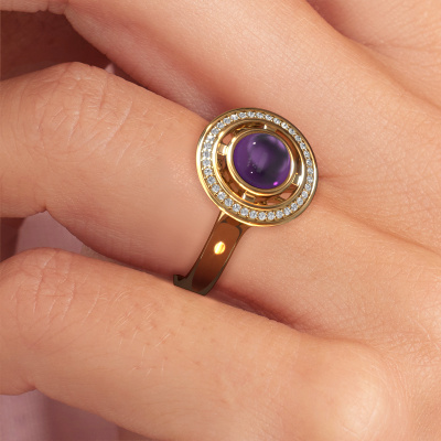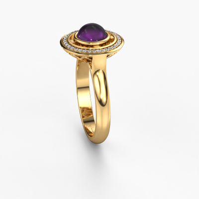 In this photo the gold Salima ring is set with a cabochon amethyst. Cabochon means a amethyst is shaped first, not faceted, into a specific shape, such as a drop, heart or round cabochon. Subsequently, it is polished until the gemstone has a orb shaped surface. A cabochon gemstone is a stunning, classy eye-catcher that matches perfectly with a contemporary as well as a vintage style. Our expert goldsmiths shape the special ring to perfection which makes it unique. The cabochon amethyst is set so its unique qualities are strengthened. How do you like this design gold ring? Simply customize this Salima ring, using our online tool. Subsequently, your personal special Salima ring will be made by hand by our goldsmiths. Precious metals and gemstones can be customized to your liking. Do you have specific preferences which are unavailable in our online tool? Please feel free to contact us. We will customize your personal design ring to your liking.After receiving your order, our goldsmiths will passionately start the creative process of making your ring in our own studio. Because we don't have a big stockpile, these costs will not be passed on to you. Our pricing is proof of that! We offer top quality jewels at lowest price, guaranteed.To make it easier for you, we offer a 30 day return policy. Check our terms and conditions.