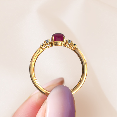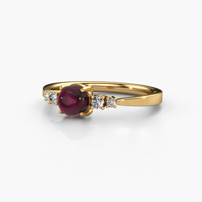 In this photo the gold Regine ring is set with a cabochon garnet. Cabochon means a garnet is shaped first, not faceted, into a specific shape, such as a drop, heart or round cabochon. Subsequently, it is polished until the gemstone has a orb shaped surface. A cabochon gemstone is a stunning, classy eye-catcher that matches perfectly with a contemporary as well as a vintage style. Our expert goldsmiths shape the 5 stones ring to perfection which makes it unique. The cabochon garnet is set so its unique qualities are strengthened. Our goldsmiths passionately create your customized ring to your liking with the utmost care. The gold ring, as shown here, can be customized using our online tool. Feel free to ask our jewel designers for assistance if you want changes made which are unavailable in our online tool. We are happy to answer your questions.Are you on a budget? Please feel free to contact us, so we can go discuss your options. We offer our rings at guaranteed best price, because we make them to order. You won't find such a price anywhere else!To make it easier for you, we offer a 30 day return policy. Check our terms and conditions.
