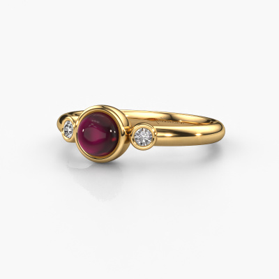 In this photo the gold Muriel ring is set with a cabochon garnet. Cabochon means a garnet is shaped first, not faceted, into a specific shape, such as a drop, heart or round cabochon. Subsequently, it is polished until the gemstone has a orb shaped surface. A cabochon gemstone is a stunning, classy eye-catcher that matches perfectly with a contemporary as well as a vintage style. Our expert goldsmiths shape the tasteful ring to perfection which makes it unique. The cabochon garnet is set so its unique qualities are strengthened. The tasteful Muriel ring, as shown here, can be customized to your liking. Our online tool offers many different options but please feel free to contact us if you want changes made to your Muriel ring, which are unavailable in our online tool.By using a combination of the latest modern techniques, combined with ancient crafting, we can make all our rings in our own studio. Each jewel is made to order. This is advantageous because we can offer you a price you won't find anywhere else.To make it easier for you, we offer a 30 day return policy. Check our terms and conditions.