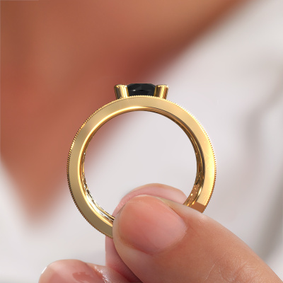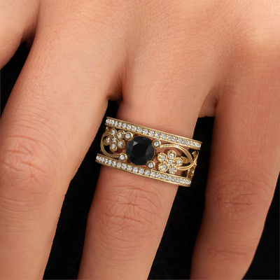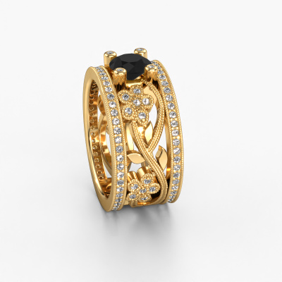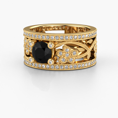 Do you have a vintage fetish? Then this gold Severine ring suits you perfectly. It's a contemporary design, based on vintage designs. A slightly romantic, extraordinary design! Even more when you customize to your liking. This graceful ring is set with exquisite black diamonds. As you can see, you can simply choose a gemstone that matches your style. Each gemstone is carefully selected by our merchants whom are spread throughout the world. Nothing but the best gems for our expert goldsmith! After all, it is his crowning glory!Our goldsmiths passionately create your customized ring to your liking with the utmost care. The gold ring, as shown here, can be customized using our online tool. Feel free to ask our jewel designers for assistance if you want changes made which are unavailable in our online tool. We are happy to answer your questions.After receiving your order, our goldsmiths will passionately start the creative process of making your ring in our own studio. Because we don't have a big stockpile, these costs will not be passed on to you. Our pricing is proof of that! We offer top quality jewels at lowest price, guaranteed.To make it easier for you, we offer a 30 day return policy. Check our terms and conditions.