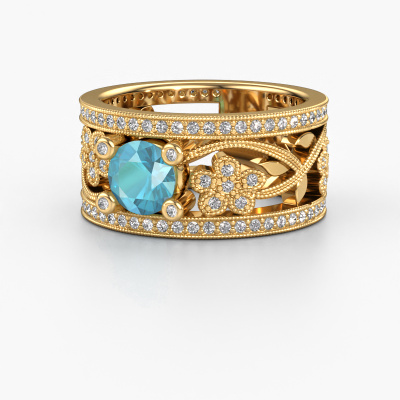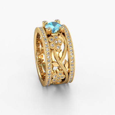 Do you have a vintage fetish? Then this gold Severine ring suits you perfectly. It's a contemporary design, based on vintage designs. A slightly romantic, extraordinary design! Even more when you customize to your liking. This graceful ring is set with exquisite blue topaz. As you can see, you can simply choose a gemstone that matches your style. Each gemstone is carefully selected by our merchants whom are spread throughout the world. Nothing but the best gems for our expert goldsmith! After all, it is his crowning glory!Our goldsmiths passionately create your customized ring to your liking with the utmost care. The gold ring, as shown here, can be customized using our online tool. Feel free to ask our jewel designers for assistance if you want changes made which are unavailable in our online tool. We are happy to answer your questions.After receiving your order, our goldsmiths will passionately start the creative process of making your ring in our own studio. Because we don't have a big stockpile, these costs will not be passed on to you. Our pricing is proof of that! We offer top quality jewels at lowest price, guaranteed.To make it easier for you, we offer a 30 day return policy. Check our terms and conditions.