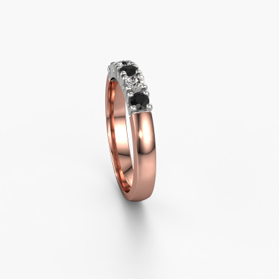 This extraordinary ring is called Rianne 5. This type of ring is known as a memoire ring, because its gemstones are set in a continuous line. This makes it easy to combine with other rings. The band of this 14 Carat rose gold ring is set in a combination of black diamond and diamond 0.448 crt. You can easily choose the combination you prefer online. As you can see, a single black diamond is set in this single alliance rose gold ring. The memoire ring represents collaboration. And that is precisely what these gemstones do, collaborate. Together they add a beautiful effect to the band of a classic ring! Such a meaningful ring, wouldn't you agree? All our hand selected black diamonds are positioned by hand by our expert goldsmith. It's a precise task, which can only be completed successfully through the combination of pure craftsmanship and usage of the latest techniques which give it an optimal effect. To create a perfect reflection of light, all the gemstones have to be perfectly aligned in the same way. During manufacturing, the expert goldsmith will therefore monitor the reflection of light constantly to check whether the black diamonds are aligned properly. This requires a skilled hand and a lot of patience but then the end product will be a true piece of art. And that is our mission!By using a combination of the latest modern techniques, combined with ancient crafting, we can make all our rings in our own studio. Each jewel is made to order. This is advantageous because we can offer you a price you won't find anywhere else.
