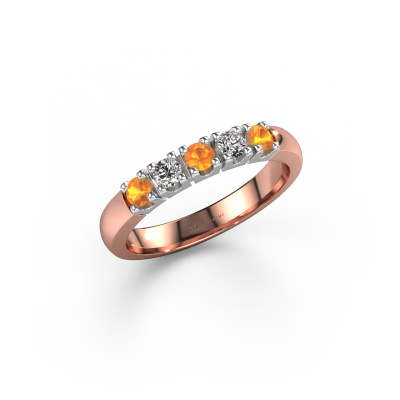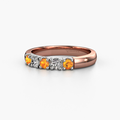 This extraordinary ring is called Rianne 5. This type of ring is known as a memoire ring, because its gemstones are set in a continuous line. This makes it easy to combine with other rings. The band of this 14 Carat rose gold ring is set in a combination of citrin and diamond 2.7 mm. You can easily choose the combination you prefer online. As you can see, a single citrin is set in this single alliance rose gold ring. The memoire ring represents collaboration. And that is precisely what these gemstones do, collaborate. Together they add a beautiful effect to the band of a classic ring! Such a meaningful ring, wouldn't you agree? All our hand selected citrin are positioned by hand by our expert goldsmith. It's a precise task, which can only be completed successfully through the combination of pure craftsmanship and usage of the latest techniques which give it an optimal effect. To create a perfect reflection of light, all the gemstones have to be perfectly aligned in the same way. During manufacturing, the expert goldsmith will therefore monitor the reflection of light constantly to check whether the citrin are aligned properly. This requires a skilled hand and a lot of patience but then the end product will be a true piece of art. And that is our mission!By using a combination of the latest modern techniques, combined with ancient crafting, we can make all our rings in our own studio. Each jewel is made to order. This is advantageous because we can offer you a price you won't find anywhere else.