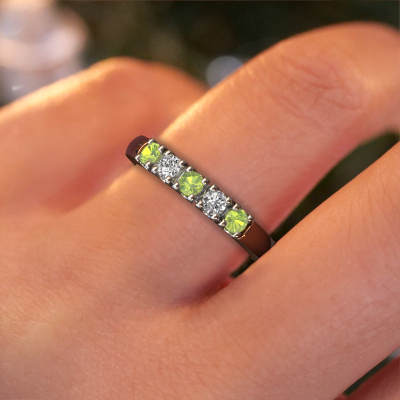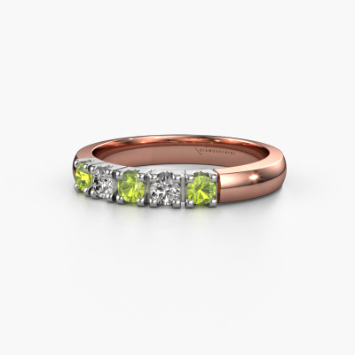 This extraordinary ring is called Rianne 5. This type of ring is known as a memoire ring, because its gemstones are set in a continuous line. This makes it easy to combine with other rings. The band of this 14 Carat rose gold ring is set in a combination of peridot and diamond 2.7 mm. You can easily choose the combination you prefer online. As you can see, a single peridot is set in this single alliance rose gold ring. The memoire ring represents collaboration. And that is precisely what these gemstones do, collaborate. Together they add a beautiful effect to the band of a classic ring! Such a meaningful ring, wouldn't you agree? All our hand selected peridot are positioned by hand by our expert goldsmith. It's a precise task, which can only be completed successfully through the combination of pure craftsmanship and usage of the latest techniques which give it an optimal effect. To create a perfect reflection of light, all the gemstones have to be perfectly aligned in the same way. During manufacturing, the expert goldsmith will therefore monitor the reflection of light constantly to check whether the peridot are aligned properly. This requires a skilled hand and a lot of patience but then the end product will be a true piece of art. And that is our mission!By using a combination of the latest modern techniques, combined with ancient crafting, we can make all our rings in our own studio. Each jewel is made to order. This is advantageous because we can offer you a price you won't find anywhere else.