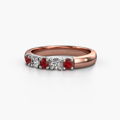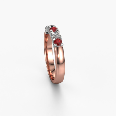 This extraordinary ring is called Rianne 5. This type of ring is known as a memoire ring, because its gemstones are set in a continuous line. This makes it easy to combine with other rings. The band of this 14 Carat rose gold ring is set in a combination of ruby and diamond 2.7 mm. You can easily choose the combination you prefer online. As you can see, a single ruby is set in this single alliance rose gold ring. The memoire ring represents collaboration. And that is precisely what these gemstones do, collaborate. Together they add a beautiful effect to the band of a classic ring! Such a meaningful ring, wouldn't you agree? All our hand selected ruby are positioned by hand by our expert goldsmith. It's a precise task, which can only be completed successfully through the combination of pure craftsmanship and usage of the latest techniques which give it an optimal effect. To create a perfect reflection of light, all the gemstones have to be perfectly aligned in the same way. During manufacturing, the expert goldsmith will therefore monitor the reflection of light constantly to check whether the ruby are aligned properly. This requires a skilled hand and a lot of patience but then the end product will be a true piece of art. And that is our mission!By using a combination of the latest modern techniques, combined with ancient crafting, we can make all our rings in our own studio. Each jewel is made to order. This is advantageous because we can offer you a price you won't find anywhere else.