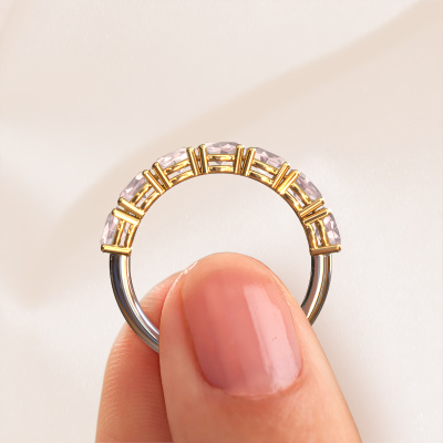 This ring called Vivienne half OVL is made of 14 Carat white gold and is set with morganite champagne. Are you in the market for a unique white gold ring with a modern twist? Then this ring might suit you. Simply customize to your or her liking. It suits the contemporary modern woman. This half eternity ring is set with beautiful morganite champagne. This has been carefully selected. Because your ring must be adorned with nothing but the most stunning gemstone. Our expert goldsmith will create your ring in our own studio, where the morganite champagne will be set with great care. The ring will then be polished to perfection to create a stunning ring.