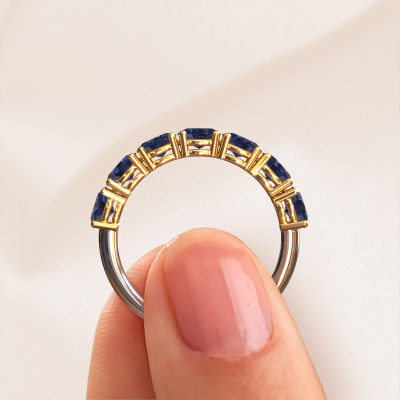 This ring called Vivienne half OVL is made of 14 Carat white gold and is set with sapphire. Are you in the market for a unique white gold ring with a modern twist? Then this ring might suit you. Simply customize to your or her liking. It suits the contemporary modern woman. This half eternity ring is set with beautiful sapphire. This has been carefully selected. Because your ring must be adorned with nothing but the most stunning gemstone. Our expert goldsmith will create your ring in our own studio, where the sapphire will be set with great care. The ring will then be polished to perfection to create a stunning ring. Because we design and deliver our own rings, we can offer you a ring at a price you won't find anywhere else. A ring is made to order, which helps prevent excess supplies, so we can make you a great price offer. We understand it feels risky, buying your ring online, but we will gladly assist in the designing process, taking your budget into consideration.Our team of talented, passionate designers add new ring designs to our online collection daily. Our objective in doing so, is to be able to offer you a wide variety of jewels. Please feel free to request a quote if you have specific wishes for your ring. We guarantee to make you an offer you can't refuse.To make it easier for you, we offer a 30 day return policy. Check our terms and conditions.