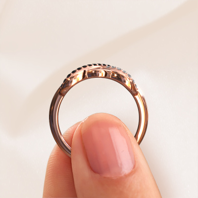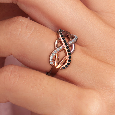 How would you describe your own style? Are you looking for something uniquely different? This infinity rose gold Lizan ring is astonishing! Simply customize to your or her own liking. This ring is set with black diamond. These black diamonds have been carefully selected because your ring must be adorned with nothing but the most beautiful gemstone. Wouldn't you agree? Our expert goldsmith will create your ring in our own crafting studios, where the black diamond will be set with care. The ring will then be polished to perfection to give it that extra sparkle. It's a perfect ring for a woman of excellent taste!As soon as you finished designing your Lizan ring with our online tool, our goldsmiths will start their creative process of making your ring. This will be done with passion and care, according ancient crafting. On top of that, our jewels are made of eco-friendly materials. Simply customize online with our online tool, if you want any changes made. If you want specific changes made to your Lizan ring, that are unavailable in our online tool, please feel free to contact our expert designers.Because we design and deliver our own rings, we can offer you a ring at a price you won't find anywhere else. A ring is made to order, which helps prevent excess supplies, so we can make you a great price offer. We understand it feels risky, buying your ring online, but we will gladly assist in the designing process, taking your budget into consideration.To make it easier for you, we offer a 30 day return policy. Check our terms and conditions.