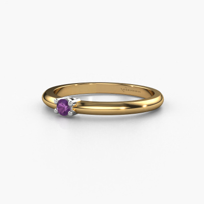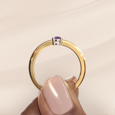 This extraordinary ring is called Michelle 1. This type of ring is known as a memoire ring, because it's birthstones are set in a continuous line. This makes it easy to combine with other rings. The band of this 14 Carat gold ring is set in a combination of amethyst and amethyst 2.7 mm. You can easily choose the combination you prefer online. As you can see, a single amethyst is set in this single alliance gold ring. The memoire ring represents collaboration. And that is precisely what these gemstones do, collaborate. Together they add a beautiful effect to the band of a classic ring! Such a meaningful ring, wouldn't you agree? All our hand selected amethysten are positioned by hand by our expert goldsmith. It's a precise task, which can only be completed successfully through the combination of pure craftsmanship and usage of the latest techniques which give it an optimal effect. To create a perfect reflection of light, all the gemstones have to be perfectly aligned in the same way. During manufacturing, the expert goldsmith will therefore monitor the reflection of light constantly to check whether the amethysten are aligned properly. This requires a skilled hand and a lot of patience but then the end product will be a true piece of art. And that is our mission!By using a combination of the latest modern techniques, combined with ancient crafting, we can make all our rings in our own studio. Each jewel is made to order. This is advantageous because we can offer you a price you won't find anywhere else.