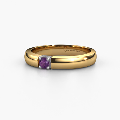 This extraordinary ring is called Rianne 1. This type of ring is known as a memoire ring, because it's birthstones are set in a continuous line. This makes it easy to combine with other rings. The band of this 14 Carat gold ring is set in a combination of amethyst and amethyst 3 mm. You can easily choose the combination you prefer online. As you can see, a single amethyst is set in this single alliance gold ring. The memoire ring represents collaboration. And that is precisely what these gemstones do, collaborate. Together they add a beautiful effect to the band of a classic ring! Such a meaningful ring, wouldn't you agree? All our hand selected amethysten are positioned by hand by our expert goldsmith. It's a precise task, which can only be completed successfully through the combination of pure craftsmanship and usage of the latest techniques which give it an optimal effect. To create a perfect reflection of light, all the gemstones have to be perfectly aligned in the same way. During manufacturing, the expert goldsmith will therefore monitor the reflection of light constantly to check whether the amethysten are aligned properly. This requires a skilled hand and a lot of patience but then the end product will be a true piece of art. And that is our mission!By using a combination of the latest modern techniques, combined with ancient crafting, we can make all our rings in our own studio. Each jewel is made to order. This is advantageous because we can offer you a price you won't find anywhere else.Our team of talented, passionate designers add new ring designs to our online collection daily. Our objective in doing so, is to be able to offer you a wide variety of jewels. Please feel free to request a quote if you have specific wishes for your ring. We guarantee to make you an offer you can't refuse.To make it easier for you, we offer a 30 day return policy. Check our terms and conditions.