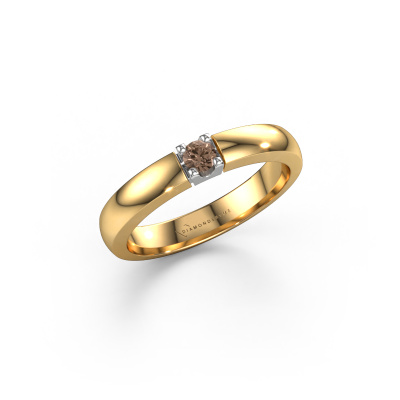 This extraordinary ring is called Rianne 1. This type of ring is known as a memoire ring, because it's birthstones are set in a continuous line. This makes it easy to combine with other rings. The band of this 14 Carat gold ring is set in a combination of brown diamond and brown diamond 0.10 crt. You can easily choose the combination you prefer online. As you can see, a single brown diamond is set in this single alliance gold ring. The memoire ring represents collaboration. And that is precisely what these gemstones do, collaborate. Together they add a beautiful effect to the band of a classic ring! Such a meaningful ring, wouldn't you agree? All our hand selected brown diamonds are positioned by hand by our expert goldsmith. It's a precise task, which can only be completed successfully through the combination of pure craftsmanship and usage of the latest techniques which give it an optimal effect. To create a perfect reflection of light, all the gemstones have to be perfectly aligned in the same way. During manufacturing, the expert goldsmith will therefore monitor the reflection of light constantly to check whether the brown diamonds are aligned properly. This requires a skilled hand and a lot of patience but then the end product will be a true piece of art. And that is our mission!By using a combination of the latest modern techniques, combined with ancient crafting, we can make all our rings in our own studio. Each jewel is made to order. This is advantageous because we can offer you a price you won't find anywhere else.Our team of talented, passionate designers add new ring designs to our online collection daily. Our objective in doing so, is to be able to offer you a wide variety of jewels. Please feel free to request a quote if you have specific wishes for your ring. We guarantee to make you an offer you can't refuse.To make it easier for you, we offer a 30 day return policy. Check our terms and conditions.